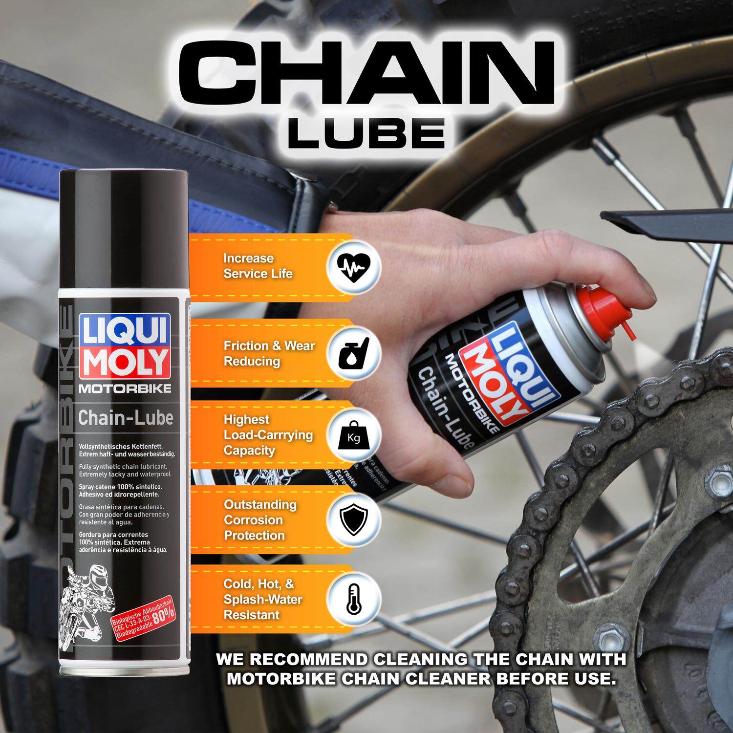 We recommend cleaning the chain with Motorbike Chain and Brake Cleaner (Part No. 1602) before use. Spray chain with Motorbike Chain Spray until white. The lubricant attains its final consistency and adherence once the solvent has evaporated.